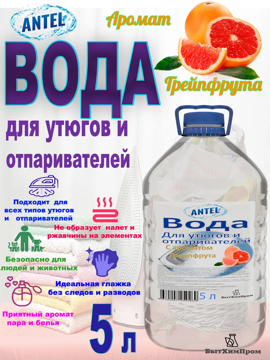 Вода для утюгов и отпаривателей ANTEL с ароматом грейпфрута — это идеальное решение для бережного ухода за вашим бельем. Формула, обогащенная натуральным ароматом грейпфрута, не только эффективно удаляет накипь и защищает утюг от образования известковых отложений, но и придает белью приятный, свежий цитрусовый аромат. Объем 5 литров обеспечит длительный срок использования, а удобная упаковка позволит легко дозировать средство.